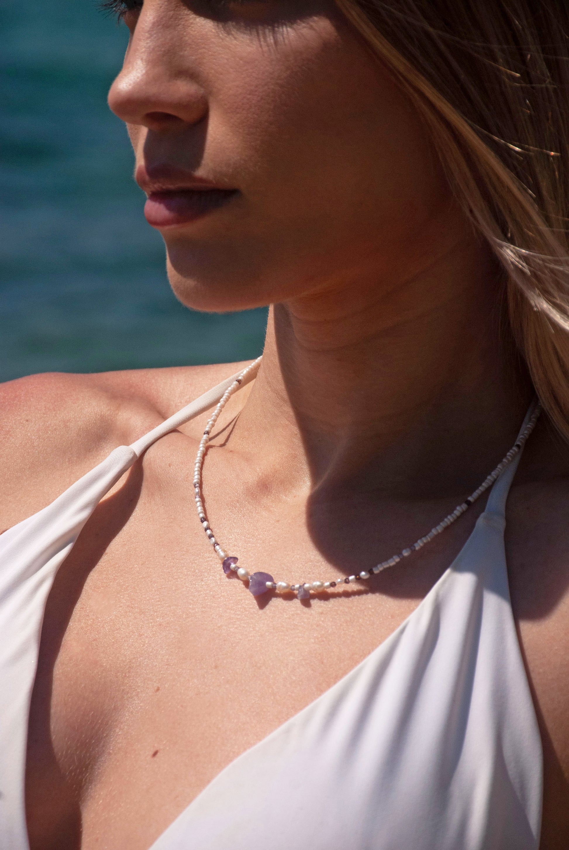 - Αμέθυστος, Χάντρες από γυαλί σε μωβ και λευκό περλέ χρώμα, μαργαριτάρια καλλιέργειας.