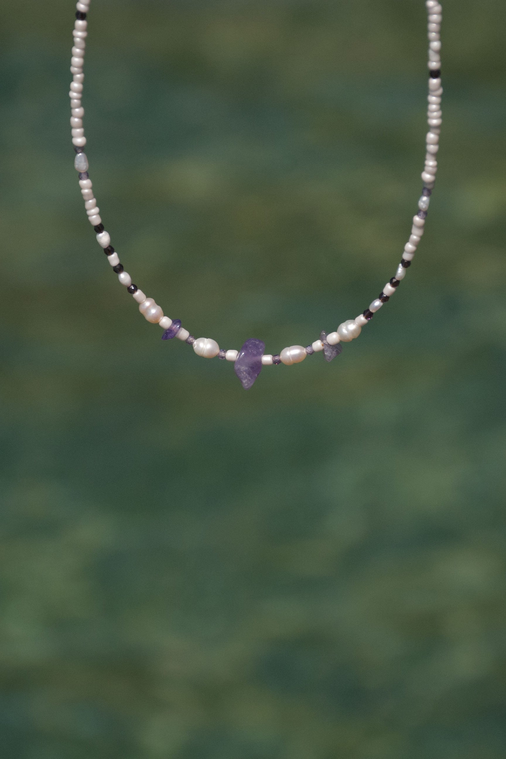 - Amethyst shards, dark purple taille glass beads, freshwater pearls, white glass beads.