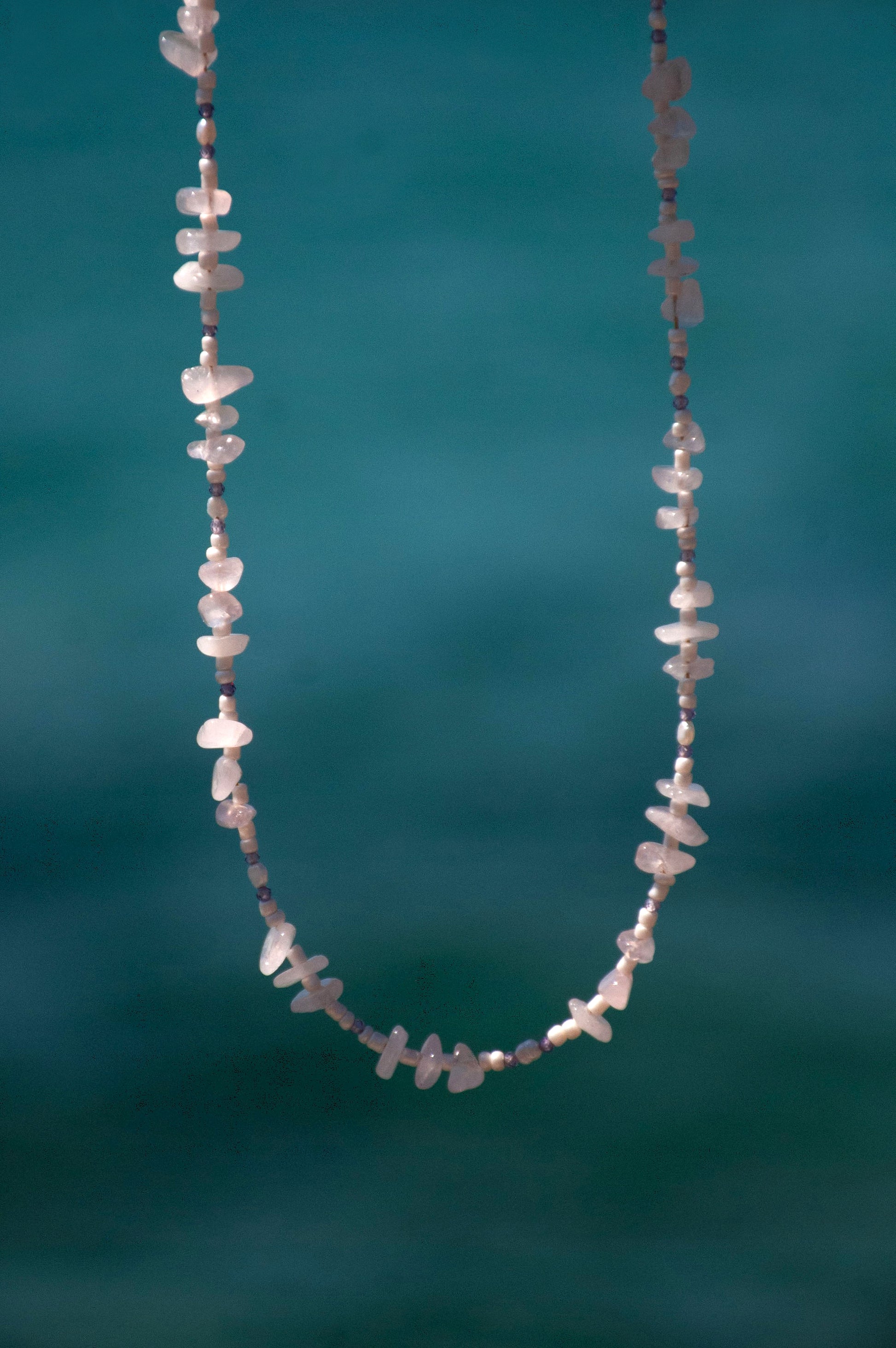 - Pink quartz shards, tiny purple taille-cut cubic zirconia beads, freshwater pearls, white glass beads.